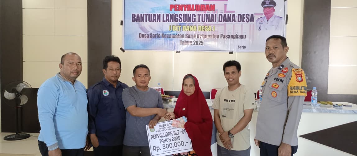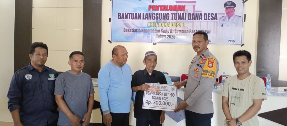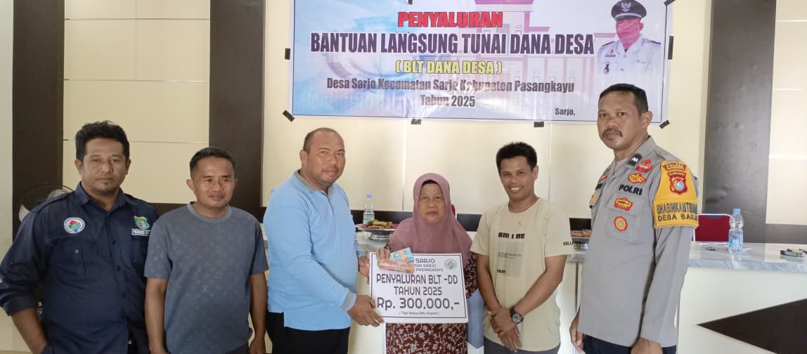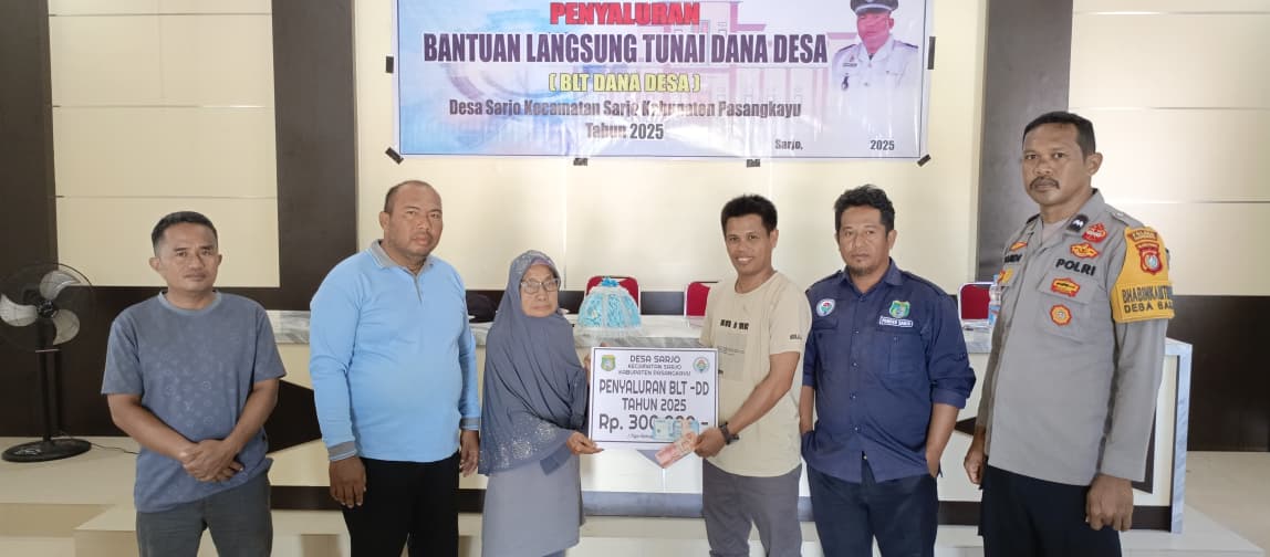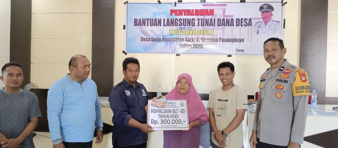Pemerintah Desa Sarjo, Kecamatan Sarjo, Kabupaten Pasangkayu telah menyalurkan Bantuan Langsung Tunai Dana Desa (BLT-DD) untuk tahap IX sampai dengan Tahap XII tahun anggaran 2025. Penyaluran bantuan ini dilaksanakan pada 10 Desember 2025 dan dihadiri oleh Camat Sarjo Diwakili Oleh Kasi Kesejahteraan Sosial (Muhtar, S.Sos), Bahbinkantibmas Desa Sarjo (Aipda Sardi) Pendamping Desa (Syaripuddin), anggota Badan Permusyawaratan Desa (BPD), serta seluruh Keluarga Penerima Manfaat (KPM) BLT-DD tahun anggaran 2025. Penyaluran BLT-DD tahap IX Sampai dengan Tahap XII ini merupakan bagian dari upaya pemerintah dalam membantu masyarakat desa yang terdampak secara ekonomi. Bantuan ini diharapkan dapat meringankan beban masyarakat dan meningkatkan daya beli mereka. Dengan adanya penyaluran bantuan ini, diharapkan perekonomian di Desa Sarjo dapat terus membaik dan masyarakat dapat memenuhi kebutuhan dasar mereka. Kehadiran Camat Sarjo, Bhabinkamtibmas Desa Sarjo, Pendamping Lokal Desa, dan BPD juga menunjukkan adanya sinergi dan pengawasan dalam proses penyaluran bantuan yang Bersumber dari Dana Desa, sehingga diharapkan bantuan tersebut tepat sasaran dan memberikan manfaat yang optimal bagi masyarakat Desa Sarjo Khususnya Penerima Keluarga Penerima Bantuan Lansung Tunai.
